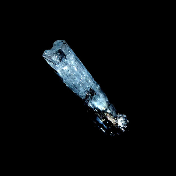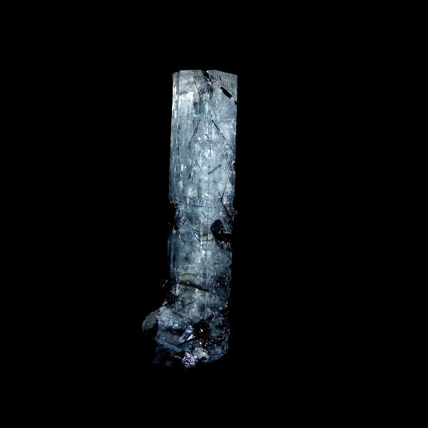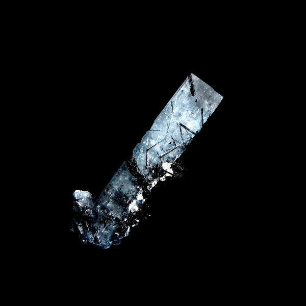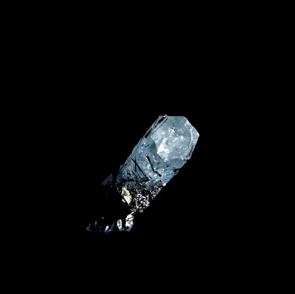 Cristal de Aguamarina con color azul de brillo intenso y terminado con grande calidad. Se encuentran al redor cristales de Turmalina negra de color y brillo intenso. Mineral muy estético