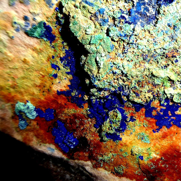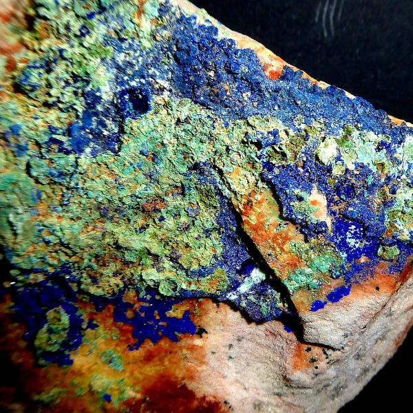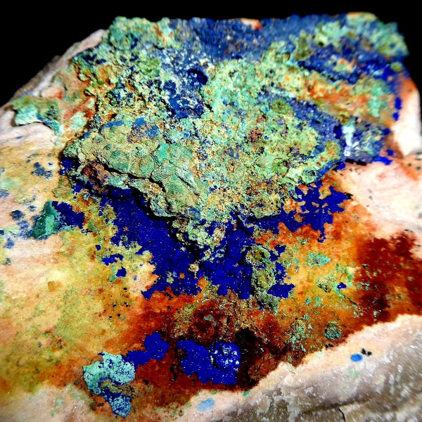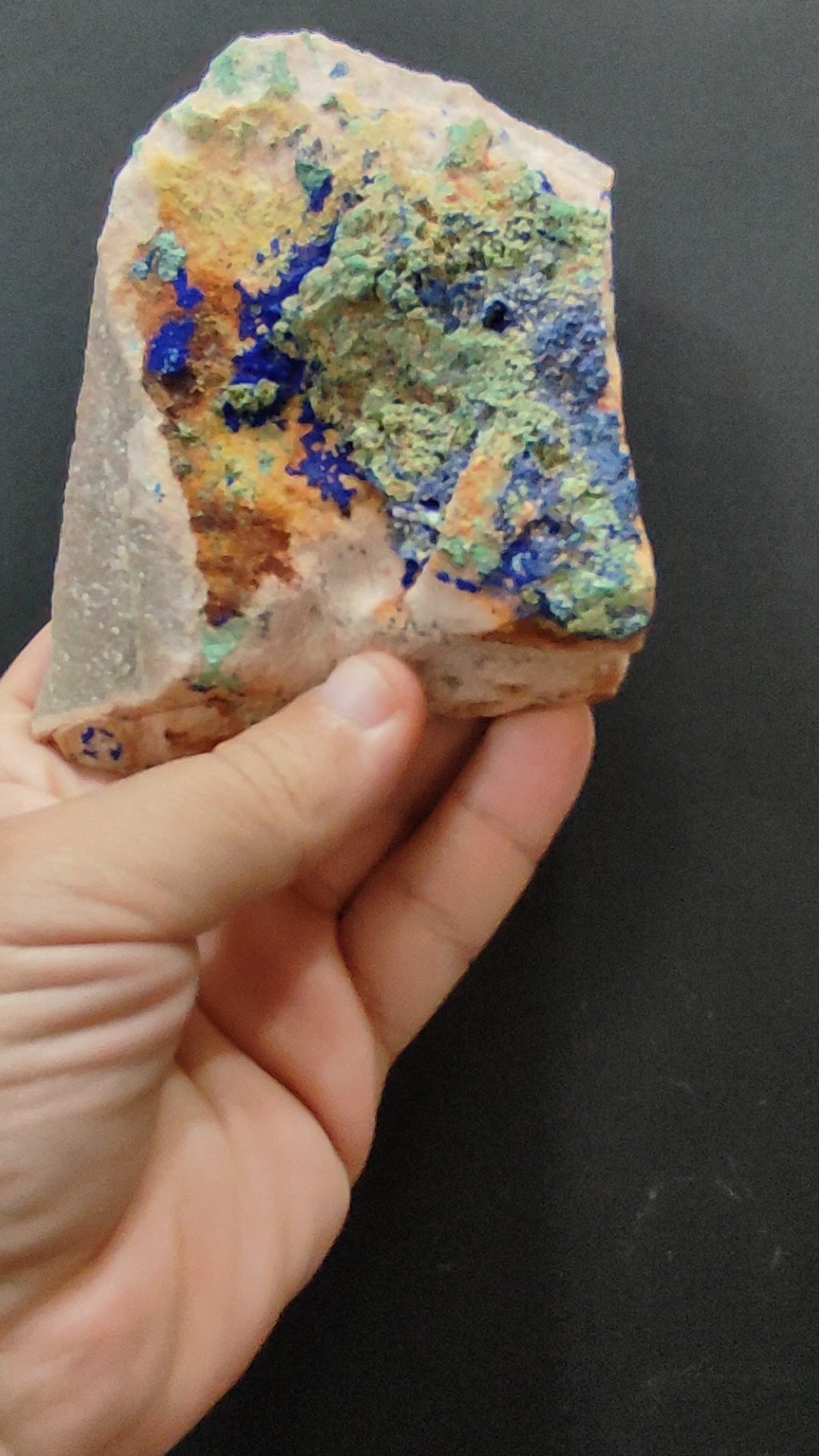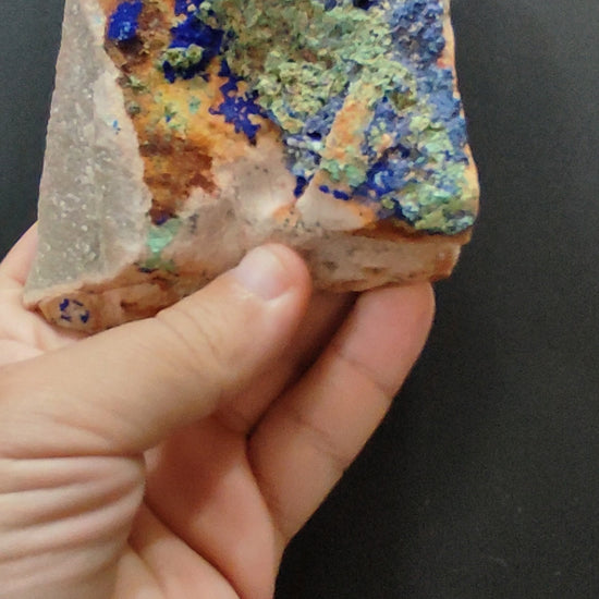 Azurita y Malaquita con muy bueno color y brillo en matriz de grande tamaño. Mineral muy estético con formaciones de grande calidad en matriz