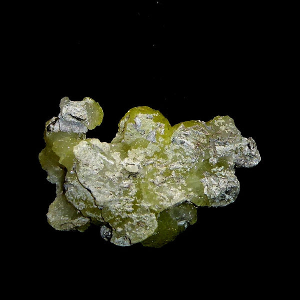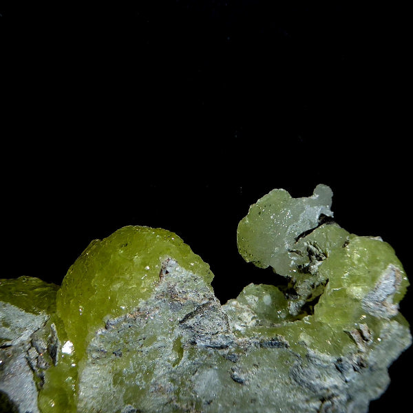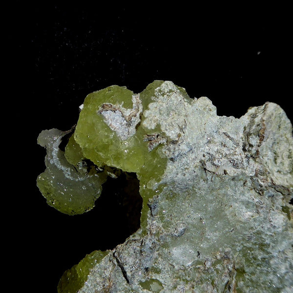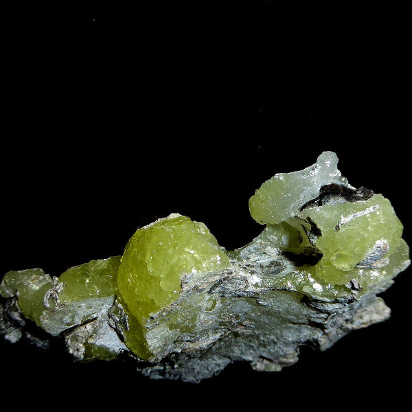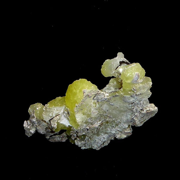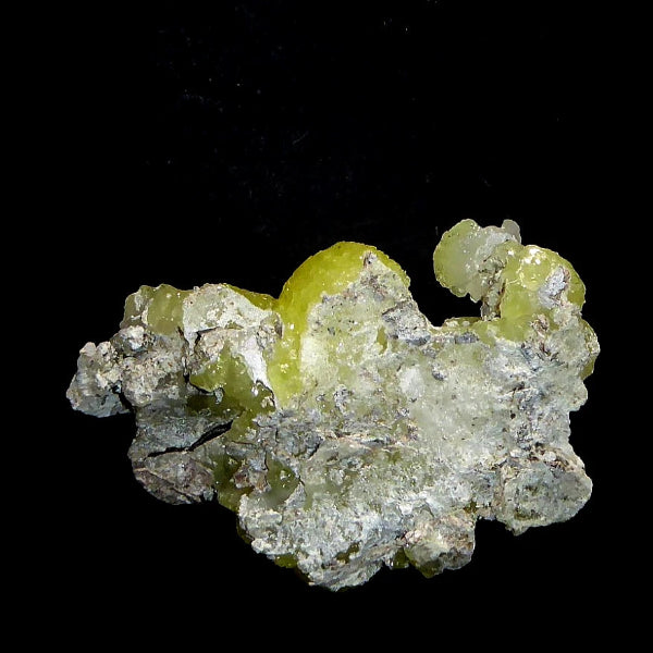 Cristales de Brucita con buenas formaciones de color amarillo limón con bueno brillo en matriz. Mineral muy estético