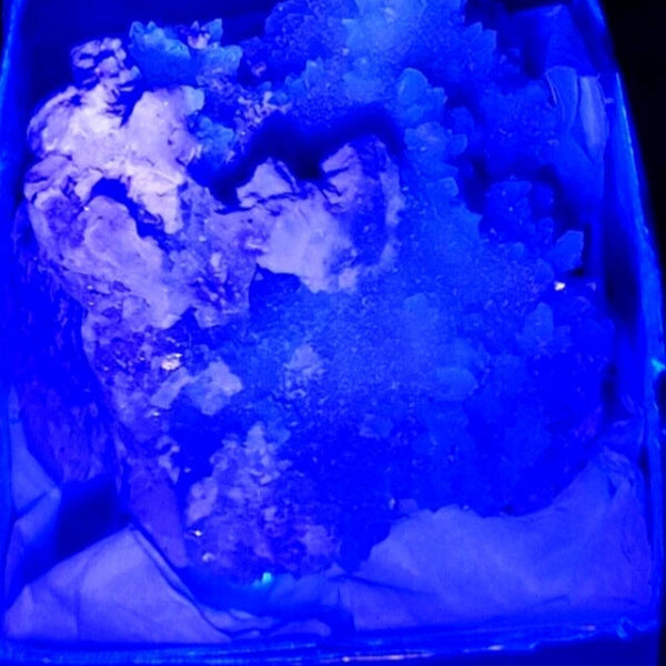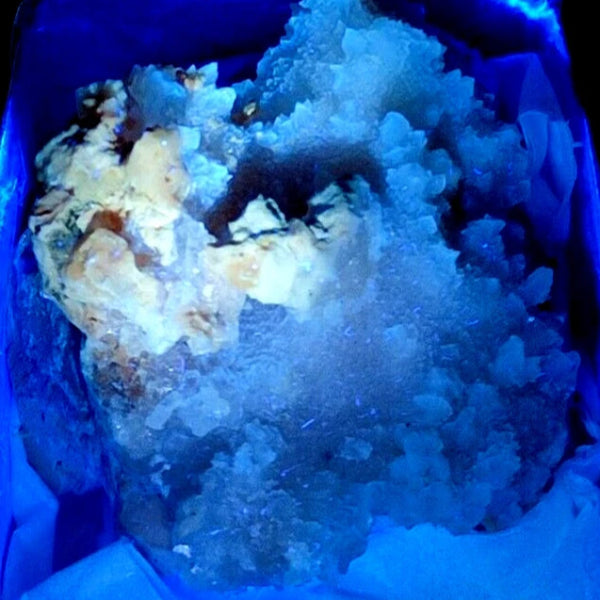 Bonitas formaciones de Calcita en matriz con color intenso y bueno brillo. Mineral donde se ve colores con 365 y 395 nm. Mineral muy estético de antigua cantera de mármol de Sureste de Madrid