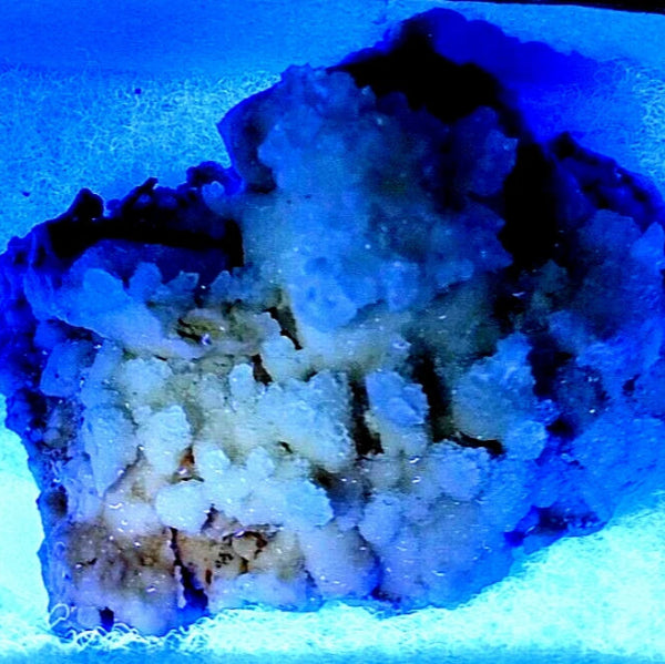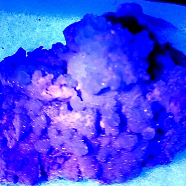 Bonitas formaciones de Calcita en matriz con color intenso y bueno brillo. Mineral donde se ve colores con 365 y 395 nm. Mineral muy estético de antigua cantera de mármol de Sureste de Madrid
