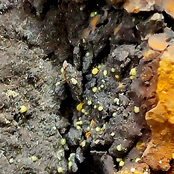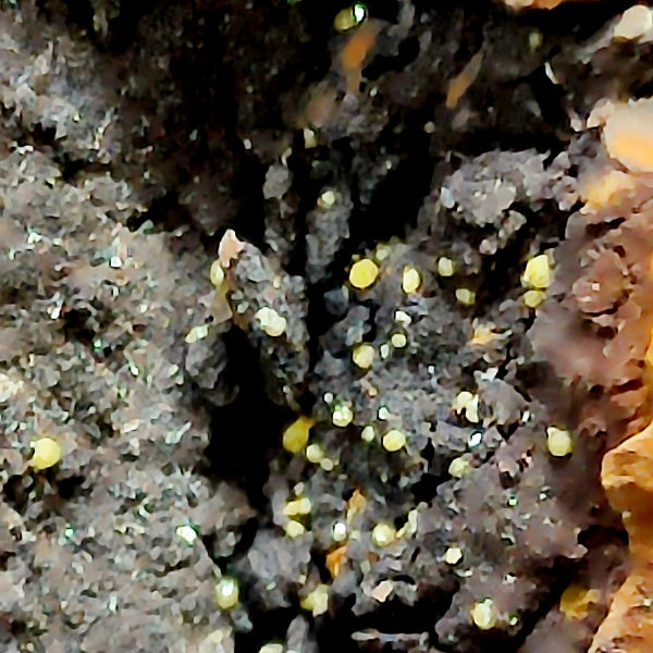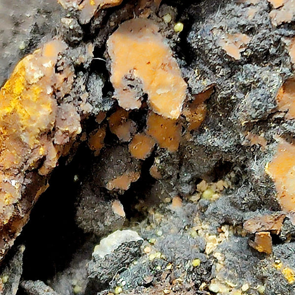 Buenas formaciones de Cerusita en matriz con bueno color y brillo. Se pueden ver formaciones de Cerusita con color naranja / amarillo con formación esférica. Mineral muy estético