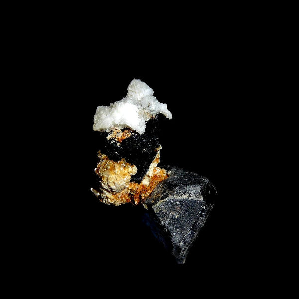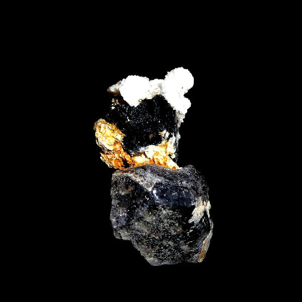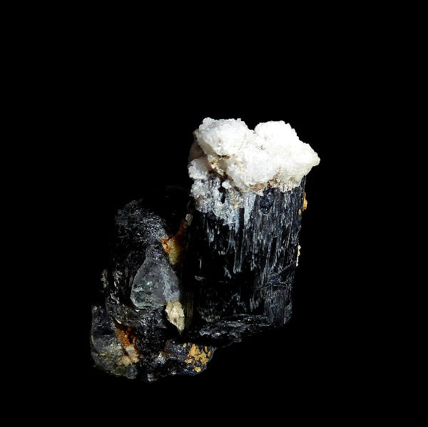 Cristales de Berilo de Goshenita en matriz de Turmalina negra de color y brillo intenso con un cristal de Fluorita de color verde. Mineral muy estético de grande calidad