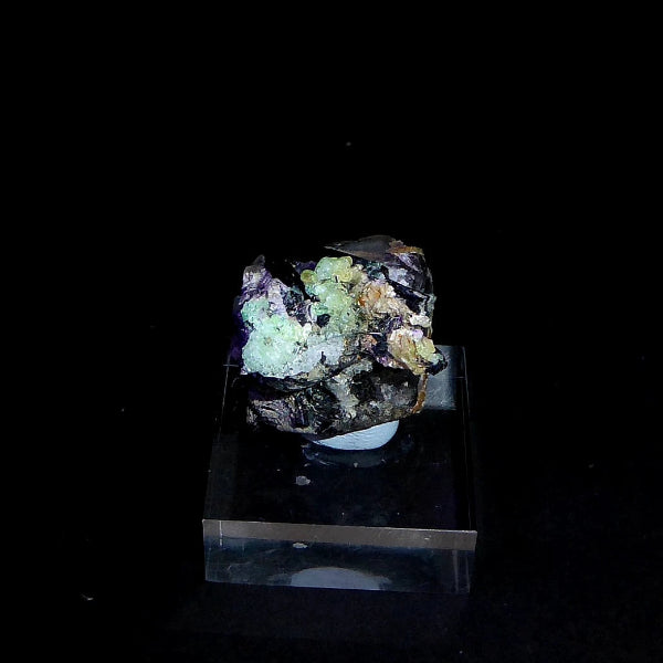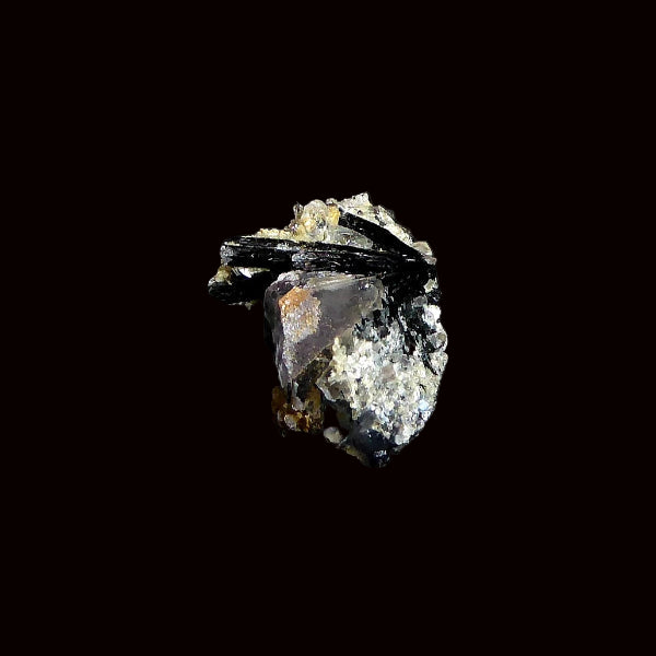 Turmalina negra en matriz de Fluorita de con interesantes formaciones con color verde y Hialita Var. Opalo que tiene luminiscencia U.V.. Mineral muy raro de gran calidad