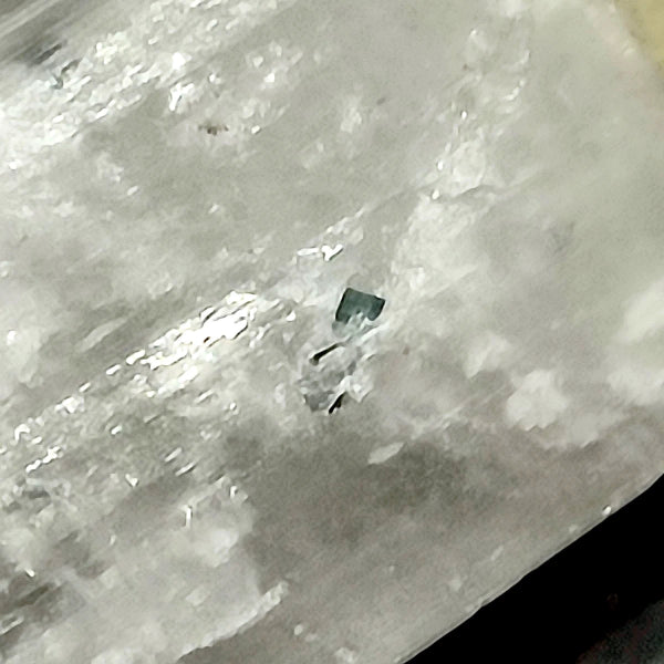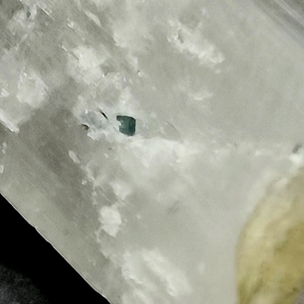 Kunzita de color verde con una Turmalina de tamaño xs en matriz con color azul. Mineral de grande calidad y muy estético
