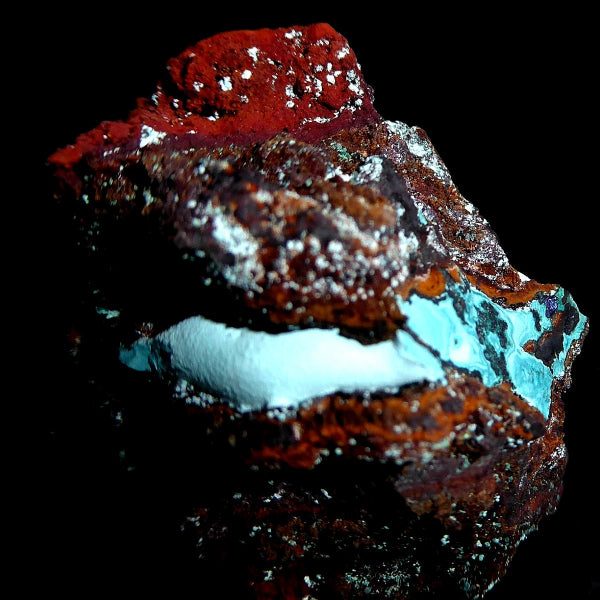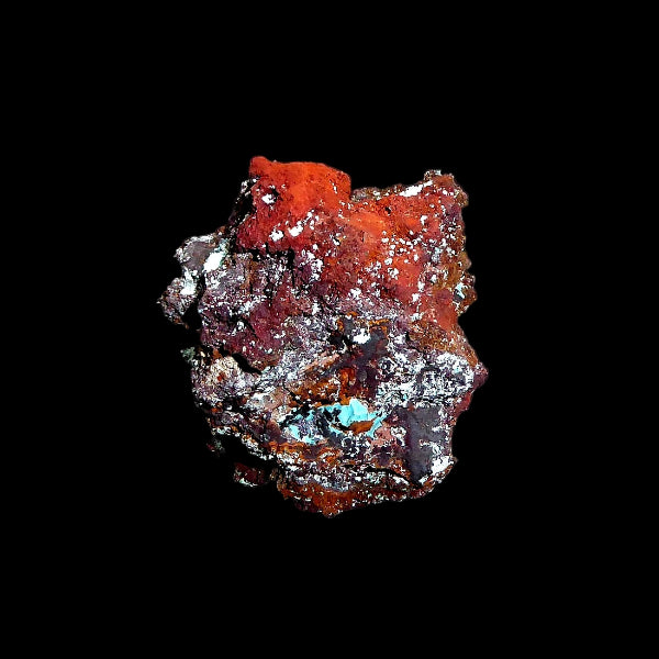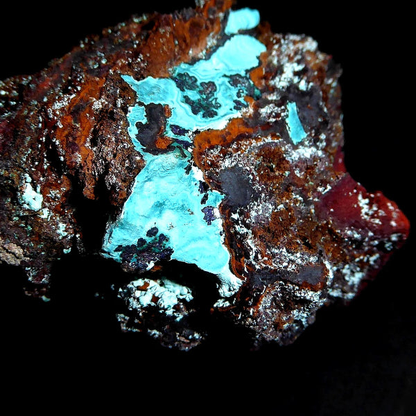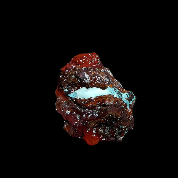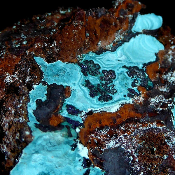 Rosasita de color azul con bueno brillo y formación en matriz marrón / rojo oscura con brillo. Mineral de muy buena calidad